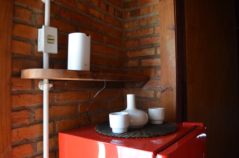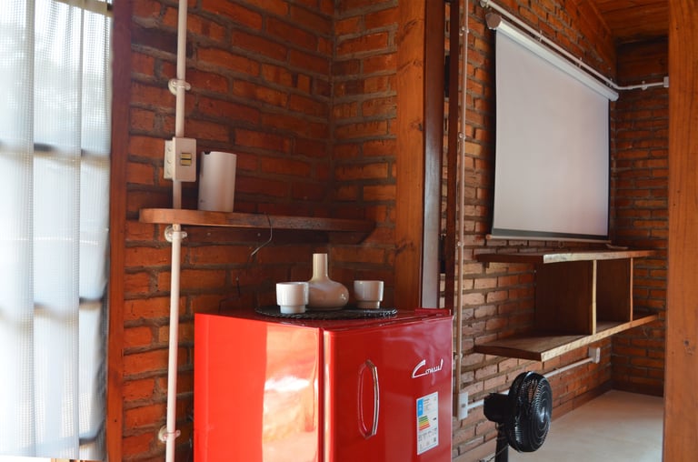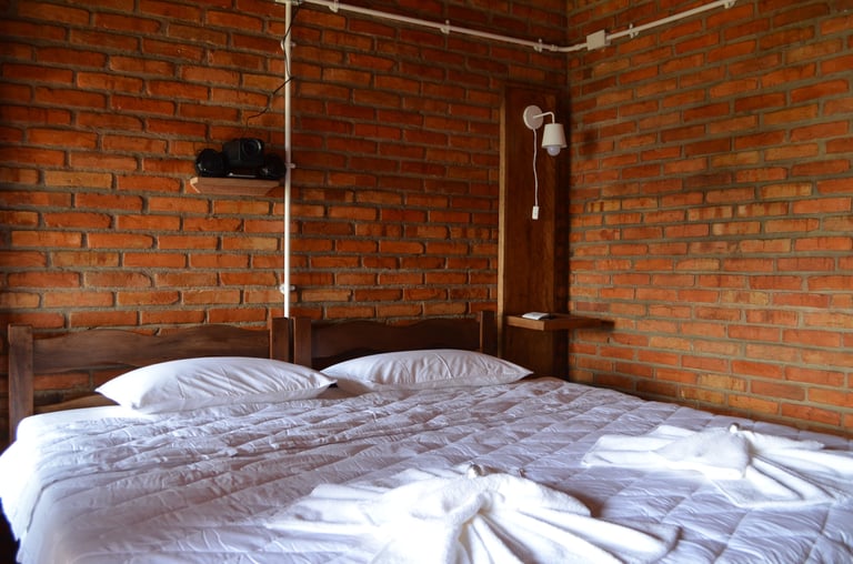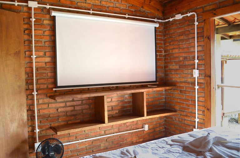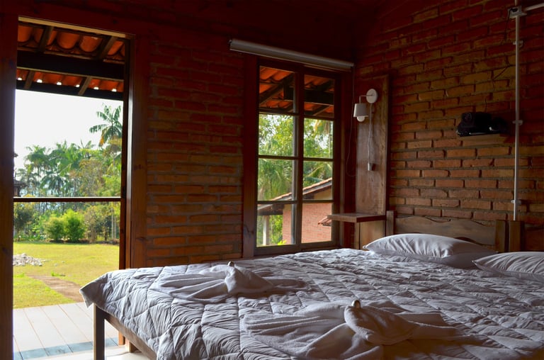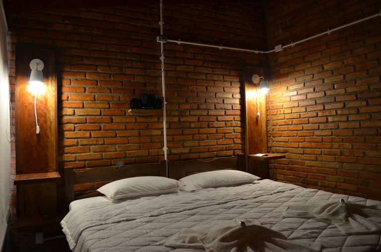 O Chalé 8 é um chalé casal branco. Acomoda confortavelmente dois adultos. Possui: cama kingsize, projetor smart e tela de projeção, frigobar, varanda, banheiro com chuveiro a gás e vista para as montanhas.